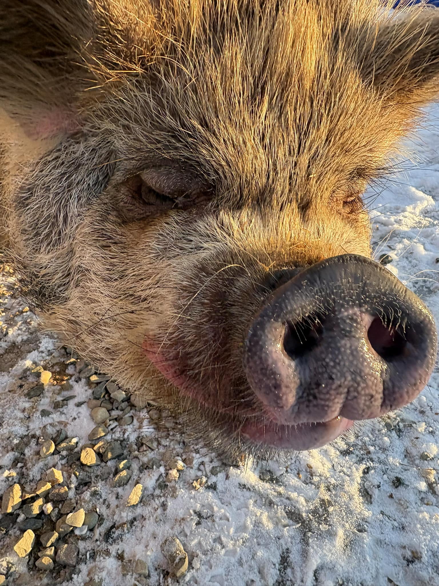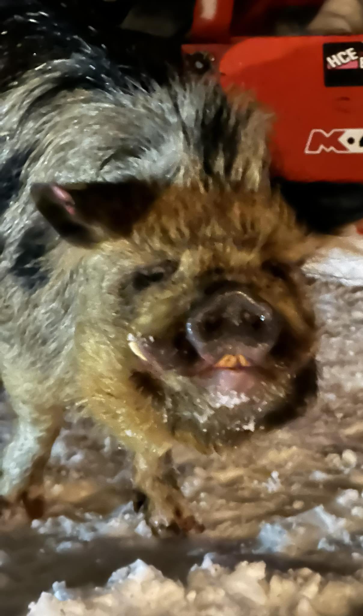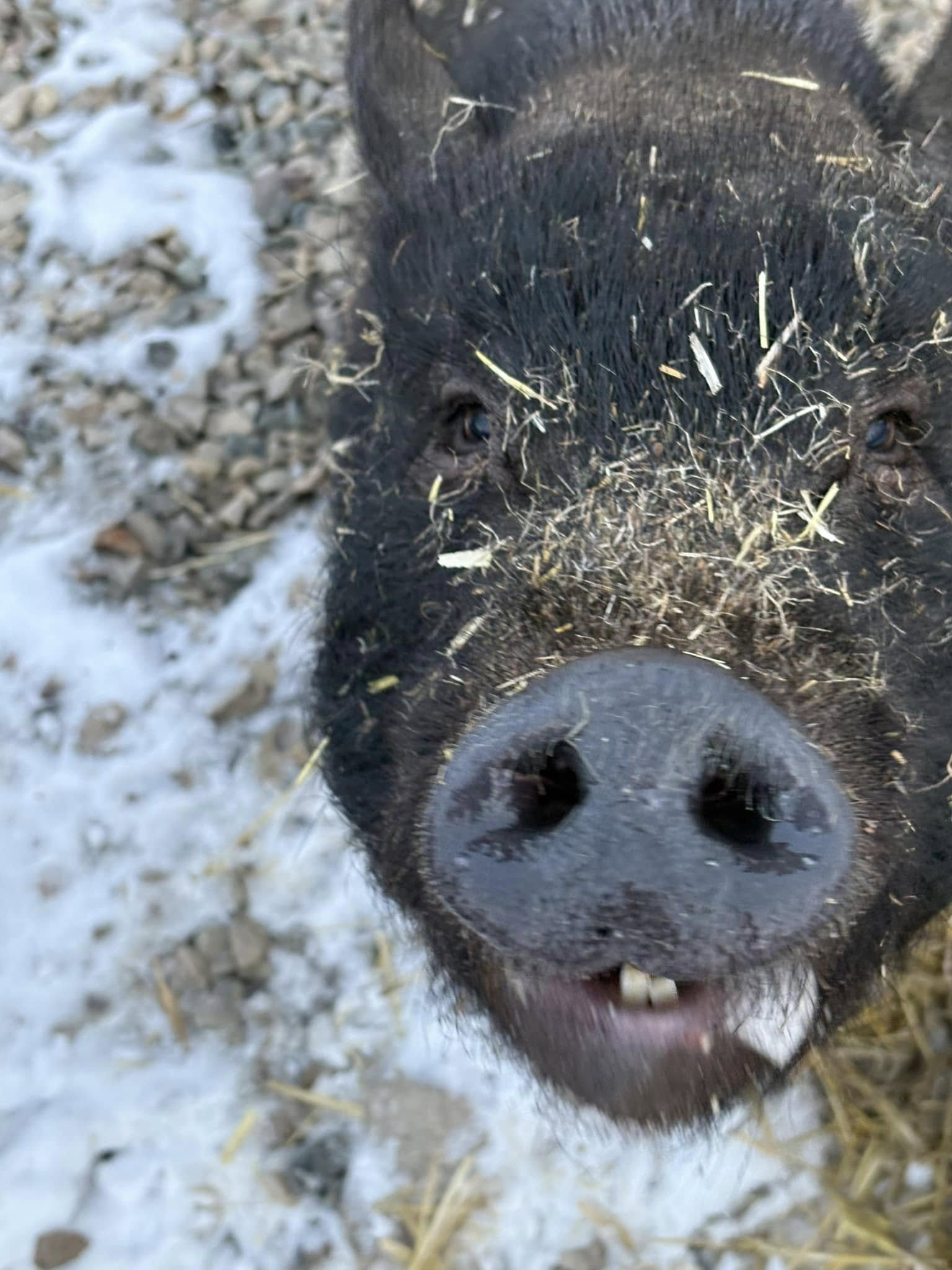 This girl was the first pig that started it all. She is currently the oldest and wisest pig of the herd, Kohks was born in June 2017 and is currently 8 years old. She came from a ranch near PG that was selling 10 week old piglets. She is a classic black mini pig who has a lot of features similar to the original Vietnamese Pot Belly Pig. Kohkos is the Cree word meaning pig, a name I chose because it was one of the many Cree words my father taught me growing up. As an only pig, she was raised in the house just like a dog or a cat. She napped on the couch, loved showers and even slept in the bed with our whole family. She can open a fridge or pantry door faster than anyone I know.