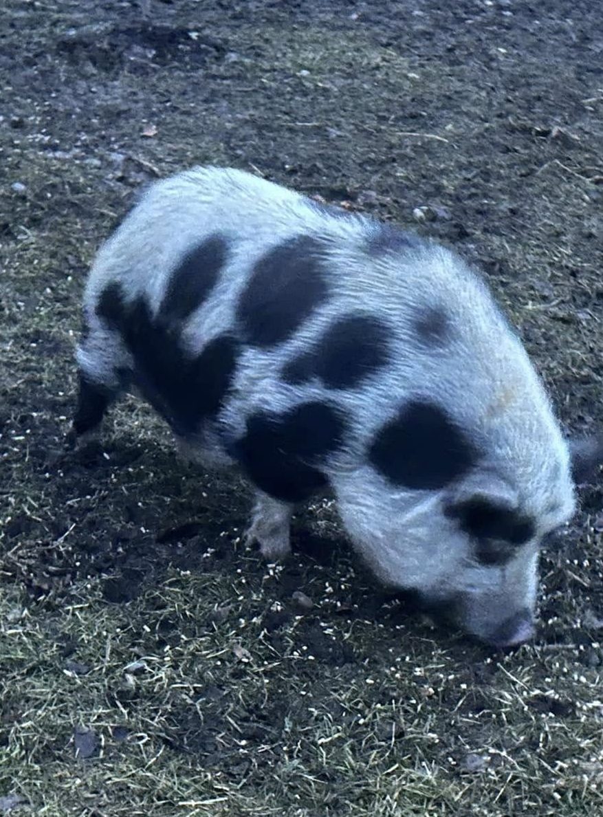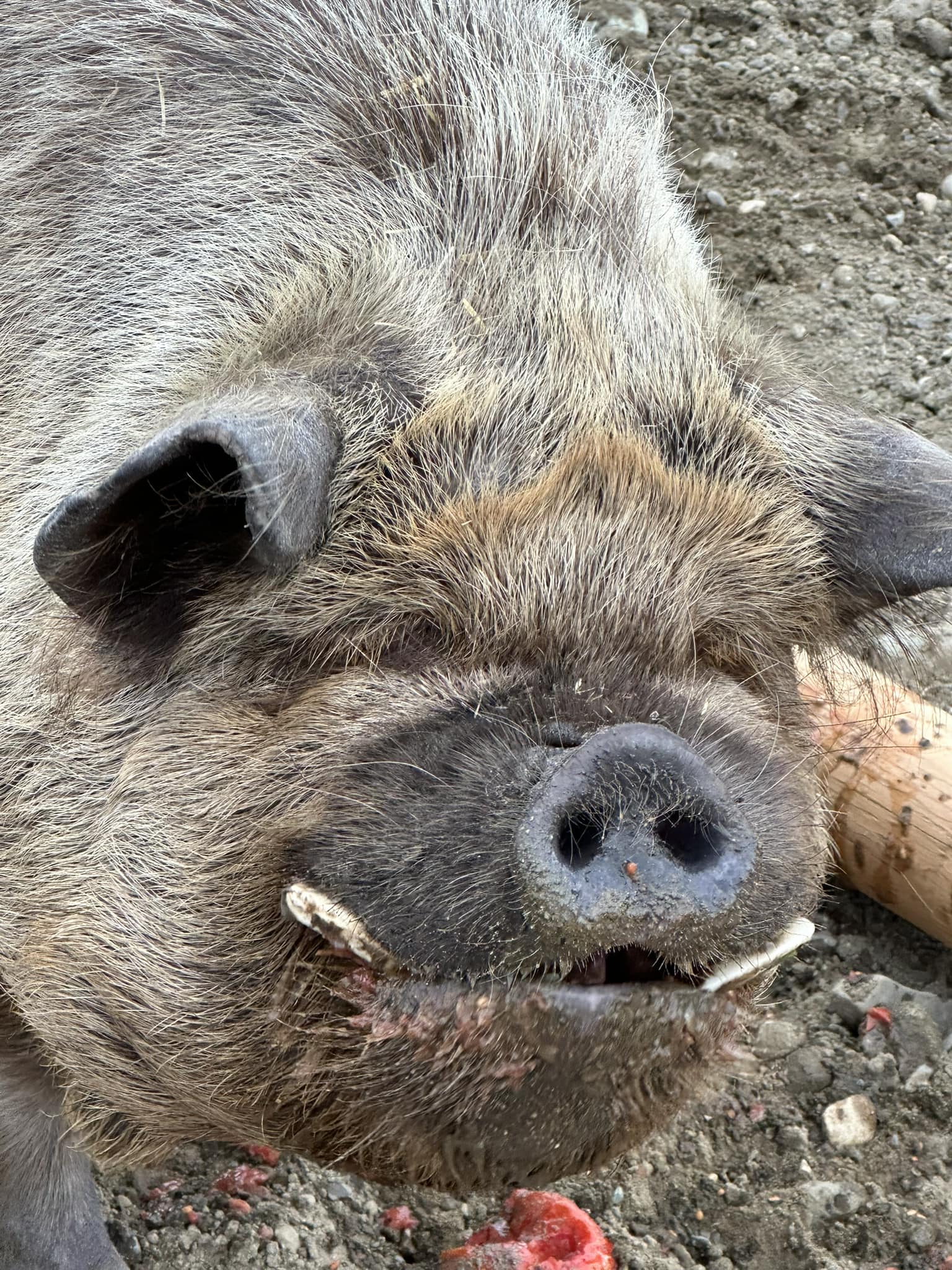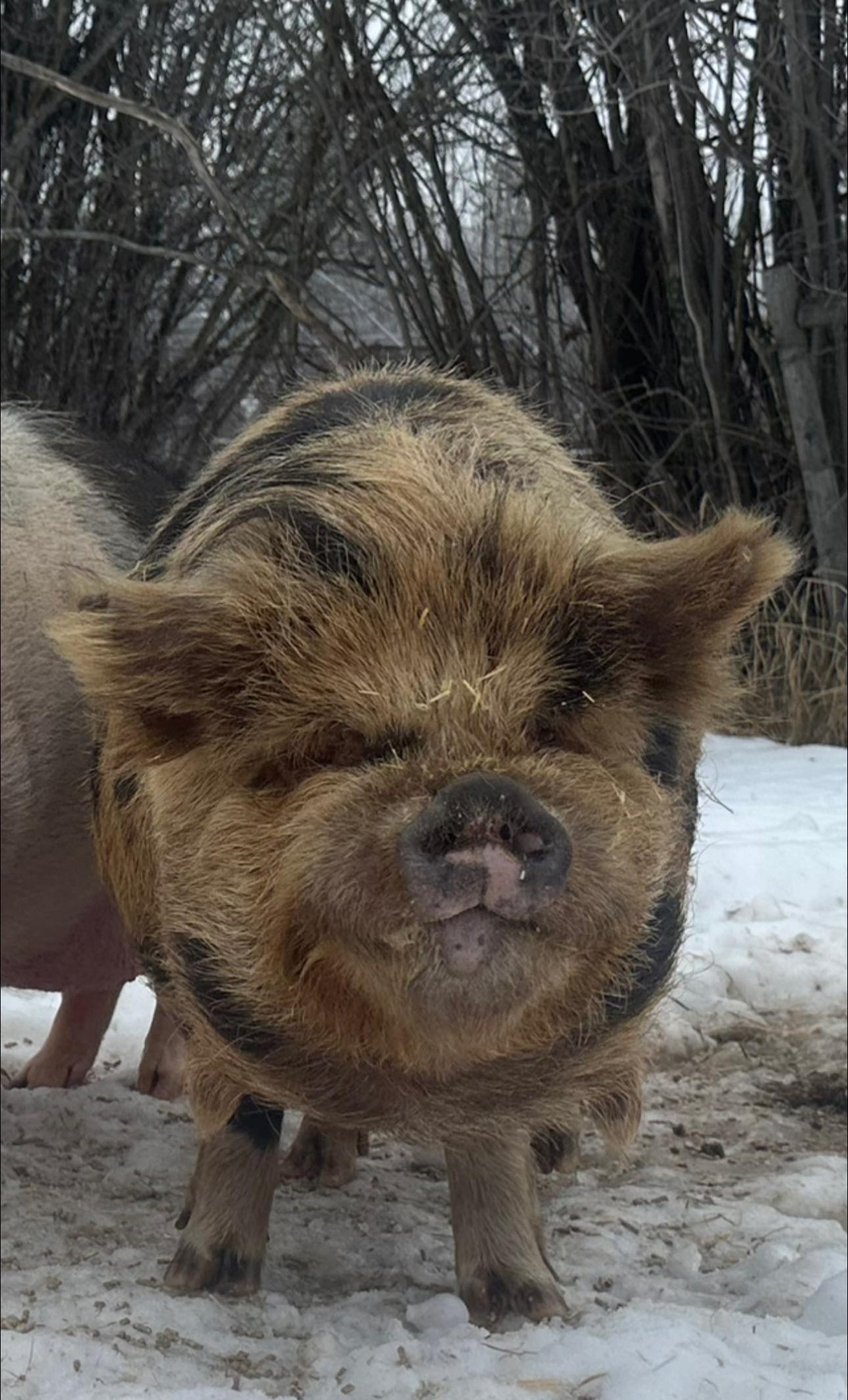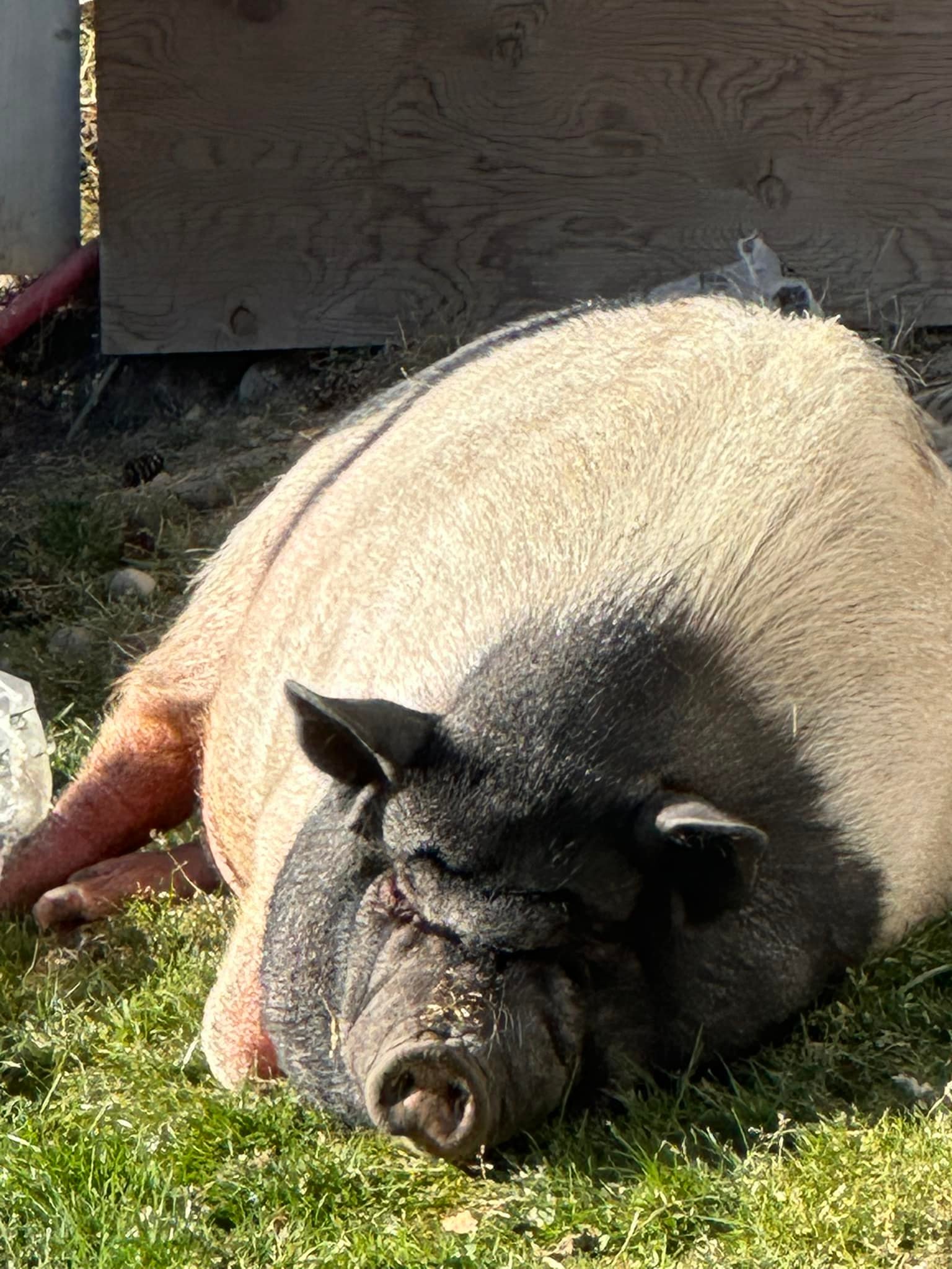 Lucy arrived with her sister Lily in March 2025. Lucy is 8 years old. She is very people friendly and loves food, almost eating my fingers every time I feed her. When she arrived, she was very reluctant to let us pet her. Over the summer she started coming to us for attention and enjoys belly rubs.. She came to us fussy about what she eats, but has learned to gobble up almost anything you give her. Lucy has clearly been top hog and has started to assert her dominance in the herd. She is much smaller than the other pigs, but doesn’t let that stop her from doing what she wants.