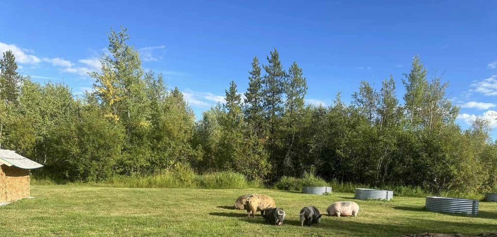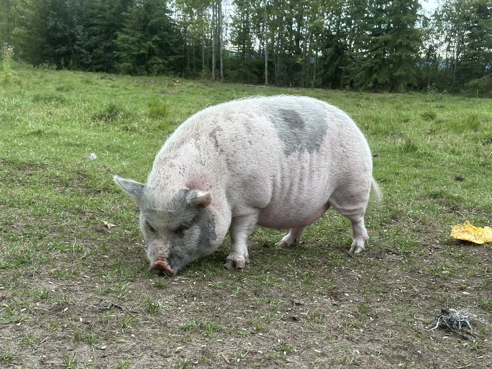Petunia came to us in June 2023. We received a phone call from a concerned person who said there was a pig at the rest stop near Hixon, BC. We drove out to the rest stop and there she was, hustling people for food. After visiting nearby properties, we were unable to find her owners. Member’s of the community helped us catch her and deliver her to our home. We searched for her owners, but no one claimed her. Petunia was a very popular girl, making live appearances on the news all the way to Ontario. She is one of our smallest pigs, who adapted very well with the herd. Petuna is a gentle, sweet girl who was always happy to lay on a dog bed in the house and nap.