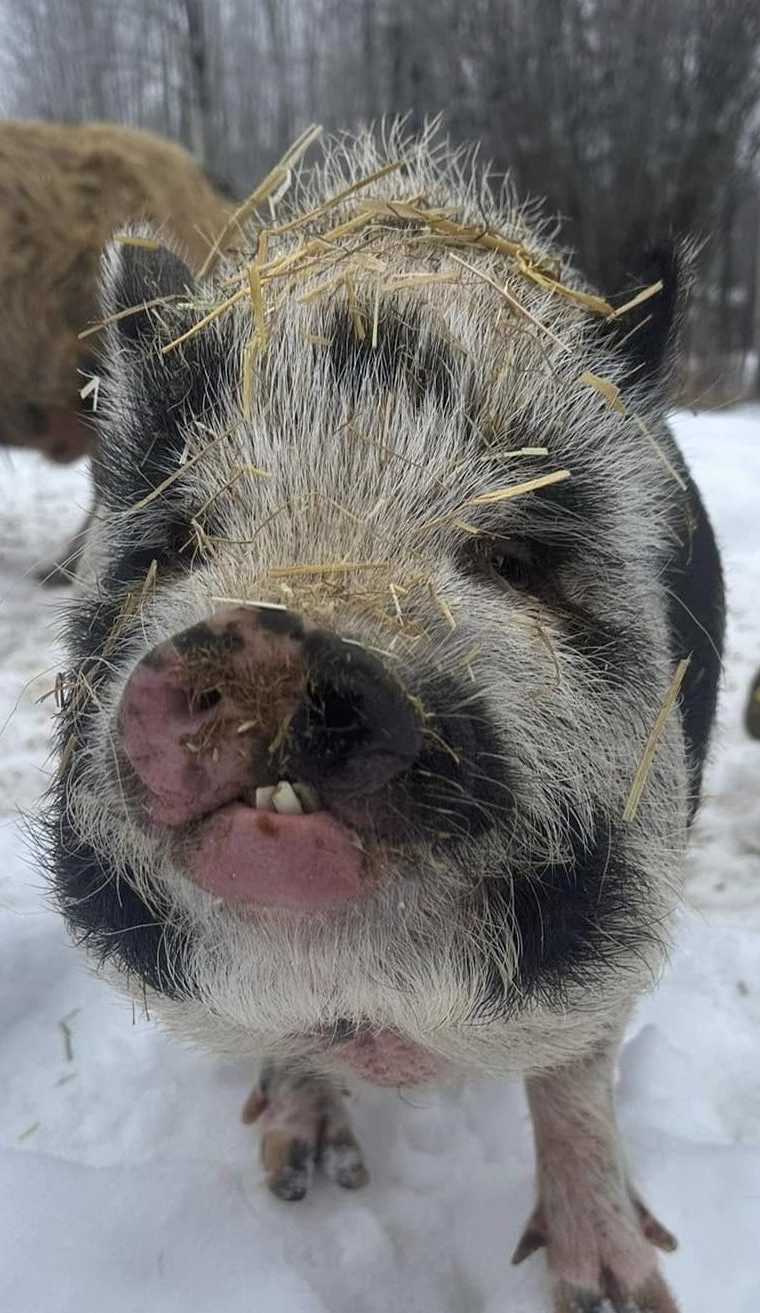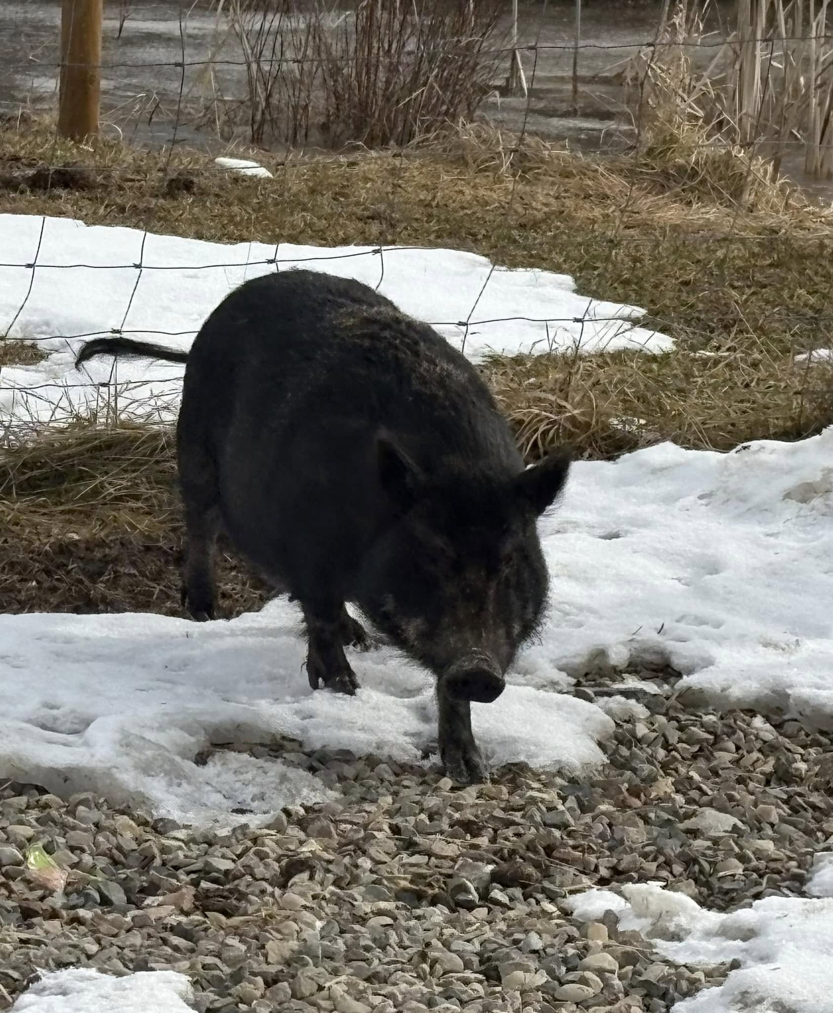 This fella was rescued in February 2023 from Green Lake, BC. Lil Guy had escaped and lived in the wilderness for over a week before returning to look for food or the other pigs. We were told that his fellow pigs were taken away and slaughtered. They did not want the same outcome for him. Lil Guy lucked out and ended up here. After fighting pneumonia twice, he is finally healthy and happy. Due to his past, he is still afraid of humans and will not let us pet him. We guess him to be 3-4 years old.